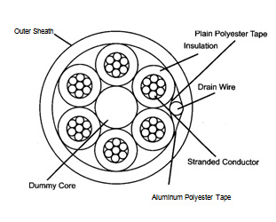 Dimensions of 0.5 sq mm multicore PVC/PE insulated Alu polyester tapped Over all Shielded Paired Cables.